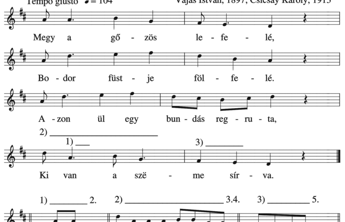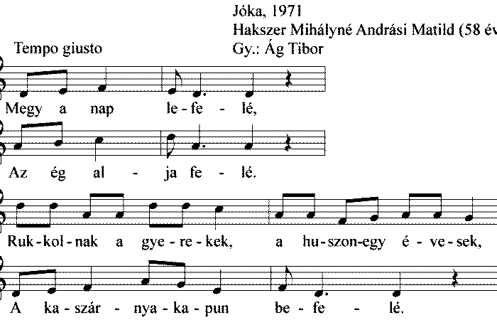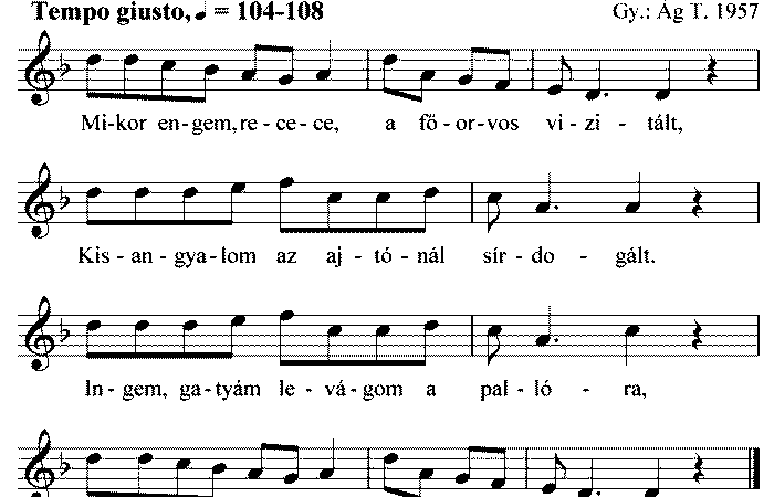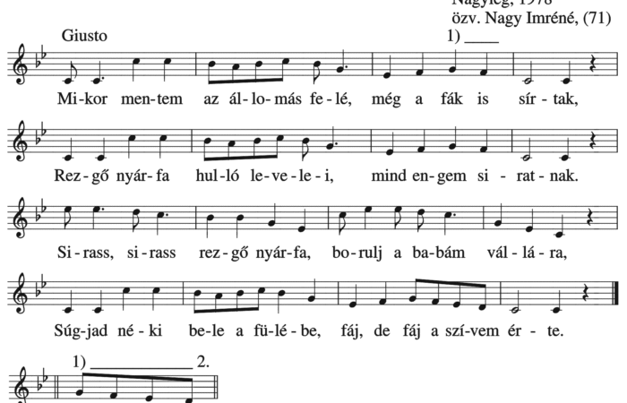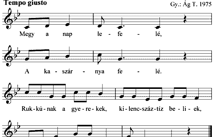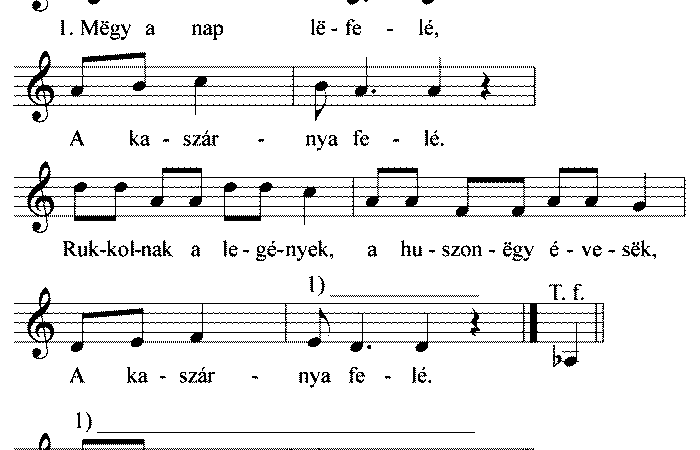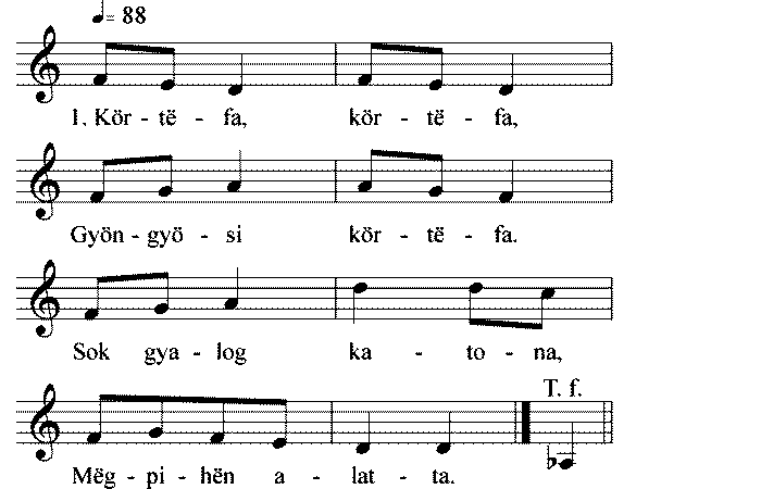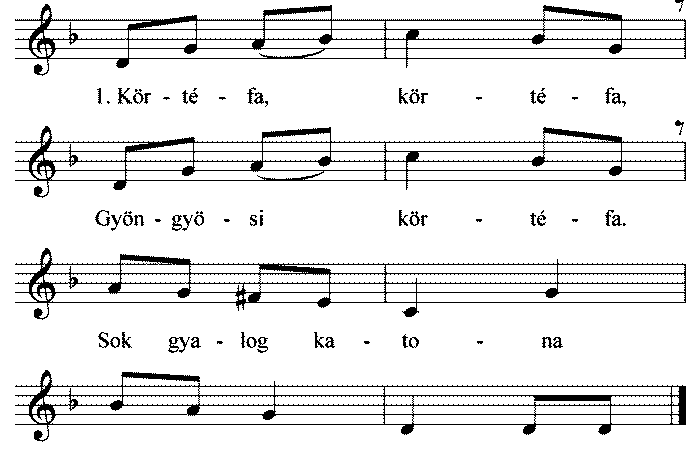 1. Körtefa, körtefa, Gyöngyösi körtefa. Sok gyalog katona, Megpihen alatta. 2. Alúrul szél fújja, Felyűrő nap sütyi. Jó annak nëvetnyi,...