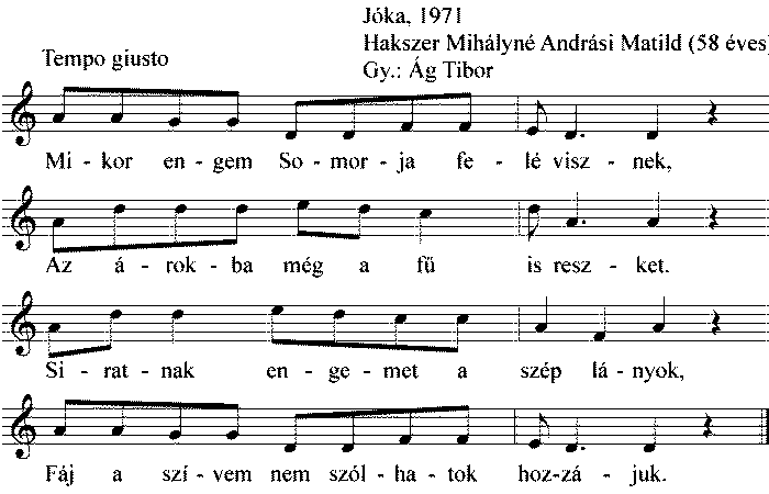 1. Mikor engem Somorja felé visznek,Az árokba még a fű is reszket.Siratnak engem a szép lányok,Fáj a szívem nem szólhatok...