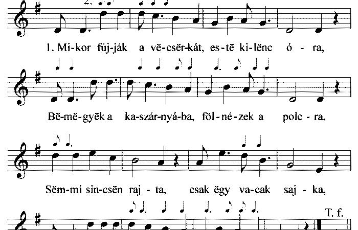 1. Korán rëggel föltekintëk a polcra, Száraz kenyér, rozsdás sajka van rajta, Száraz kenyér, rozsdás sajka van rajta, de van...