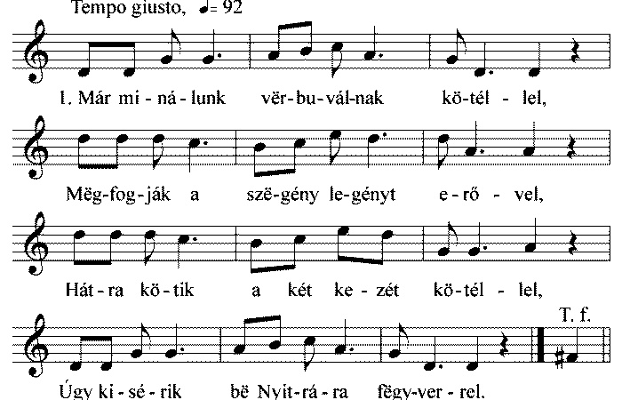 1. Már minálunk verbuválnak kötéllel, Megfogják a szegény legényt erővel, Hátra kötik a két kezét kötéllel, Úgy kisérik be Nyitrára...