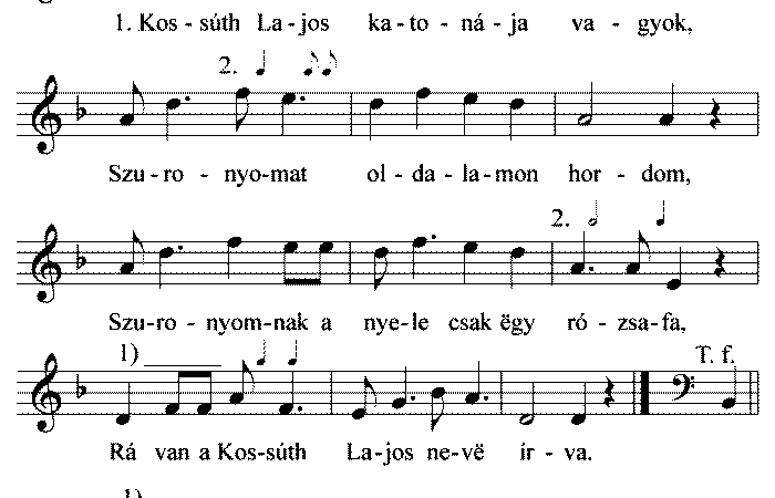 1. Kossuth Lajos katonája vagyok, Szuronyomat oldalamon hordom, Szuronyomnak a nyele csak egy rózsafa, Rá van a Kossuth Lajos neve...
