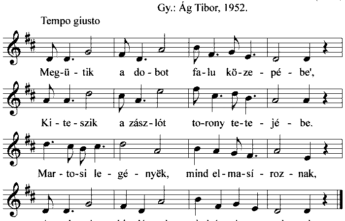 1. Megütik a dobot falu közepébe, Kiteszik a zászlót torony tetejébe, Martosi legínyëk mind elmasíroznak, A sok szép kislányok mind...