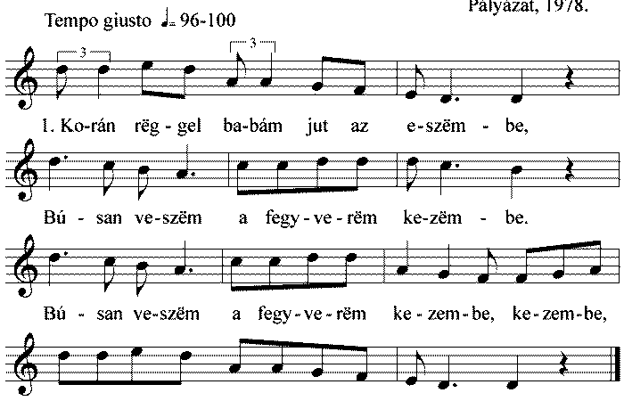 1. Korán rëggel babám jut az eszëmbe, Búsan veszëm a fegyverëm kezëmbe, Búsan veszëm a fegyverëm kezembe, kezembe, Hull a...