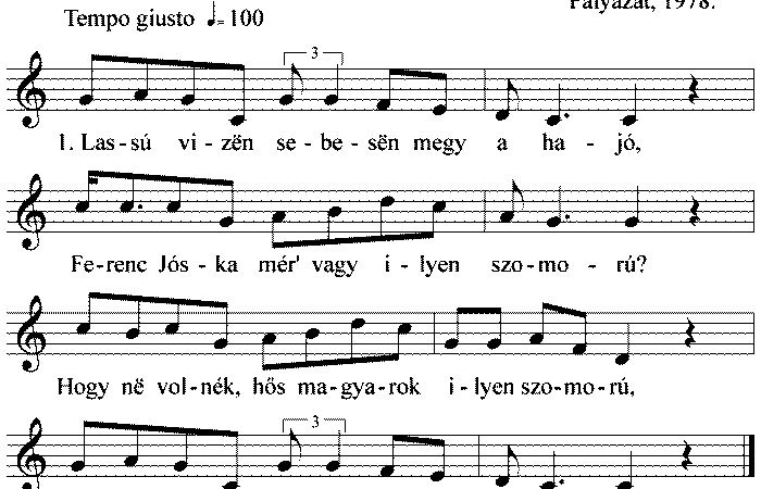 1. Lassú vizën sebesën megy a hajó, Ferenc Jóska, mér vagy ilyen szomorú? Hogy në volnék, hős magyarok, ilyen szomorú,...
