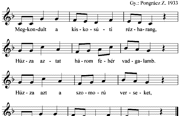 1. Megkondult a kiskosúti rézharang, Húzza aztat három fehér vadgalamb. Húzza azt a szomorú verseket, Elviszik a tízbeli gyerekeket. 2....