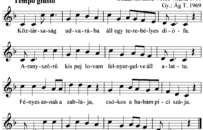 1. Köztársaság udvarába áll egy terebélyes diófa. Aranyszőrű kis pejlovam felnyergelve áll alatta. Fényes annak a zablája, csókos a babám...