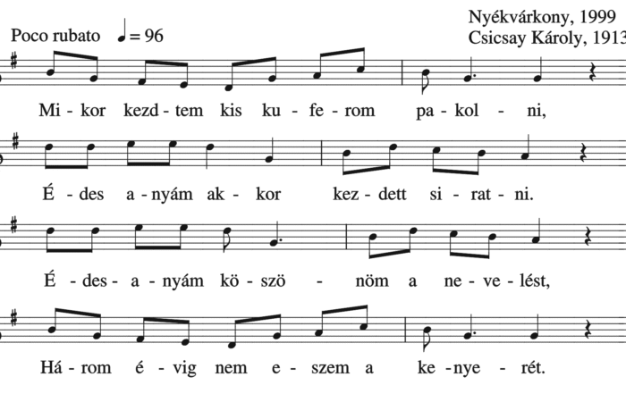 Mikor kezdtem kis kuferom pakolni, Édesanyám akkor kezdett siratni. Édesanyám, köszönöm a nevelést, Három évig nem eszem a kenyerét.