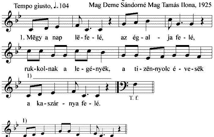 1. Mëgy a nap lëfelé, Az ég alja felé, Rukkolnak a legényëk, A tizënnyolc évesëk A kaszárnya felé. 2. Bemëgy...