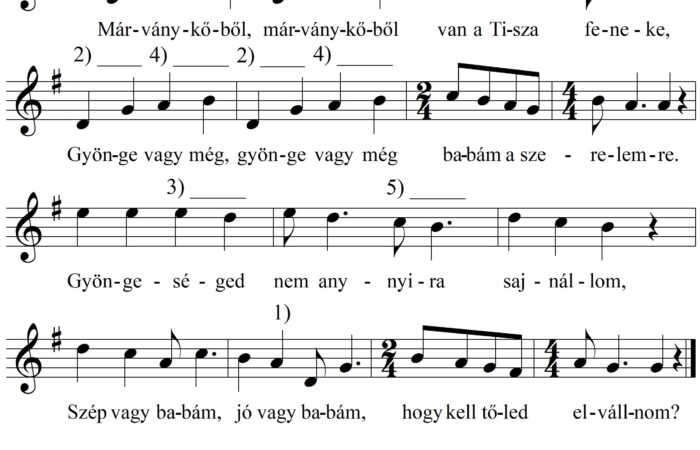 1. Márványkőből, márványkőből van a Tisza feneke, Gyönge vagy még, gyönge vagy még babám a szerelemre. Gyöngeséged nem annyira sajnálom,...
