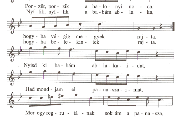 Porzik, porzik a balonyi utca,Hogyha végig megyek rajta.Nyílik, nyílik a babám ablaka,hogyha betekintek rajta.Nyisd ki babám ablakaidat.Had mondjam el panaszaimat,Mer...