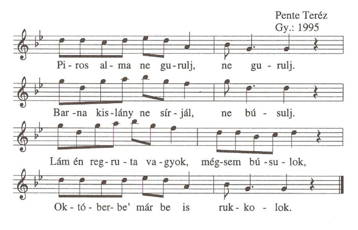 Piros alma ne gurulj, ne gurulj,Barna kislány ne sírjál, ne búsulj,Lám én regruta vagyok, mégsem búsulok,Októberbe már be is rukkolok.