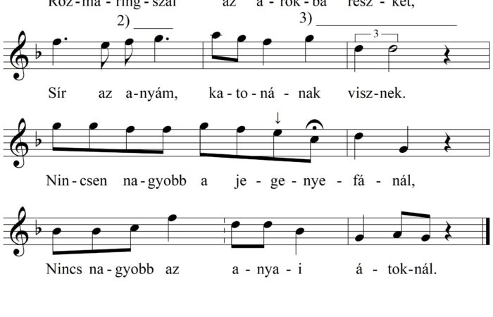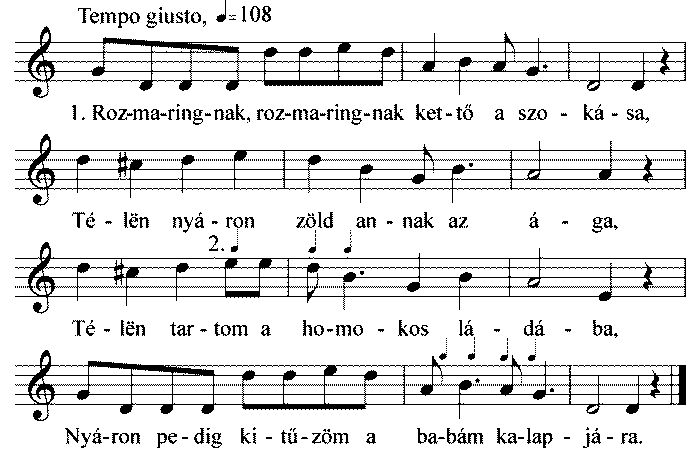 1. Rozmaringnak, rozmaringnak kettő a szokása, Télen nyáron zöld annak az ága, Télen tartom a homokos ládába, Nyáron pedig kitűzöm...