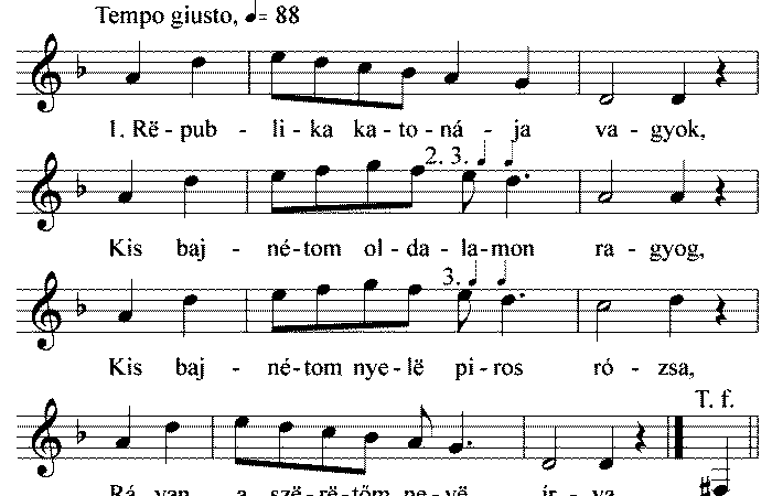 1. Republika katonája vagyok, Kis bajnétom oldalamon ragyog, Kis bajnétom nyele piros rózsa, Rá van a szeretőm neve írva. 2....
