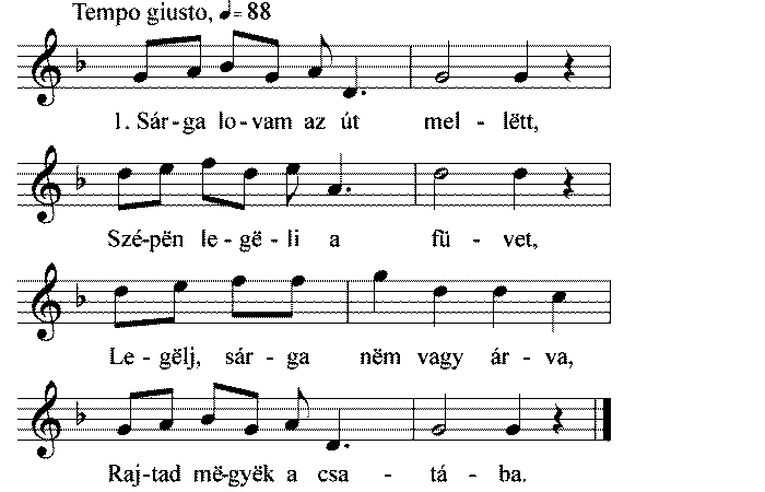 1. Sárga lovam az út mellett, Szépen legeli a füvet, Legelj, sárga nem vagy árva, Rajtad megyek a csatába. 2....