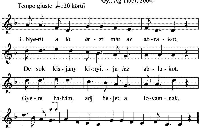 1. Nyerít a ló, érzi már az abrakot, De sok kisjány kinyitja jaz ablakot, Gyere babám Adj helyet a lovamnak,...