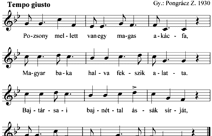 1. Pozsony mellett van egy magas akácfa, Magyar baka halva fekszik alatta. Bajtársai bajnéttal ássák sírját, Odahaza keservesen siratják. 2....