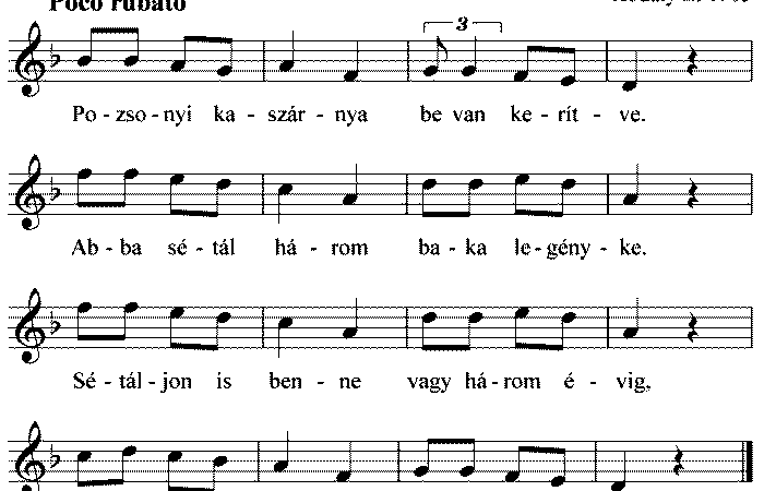 Pozsonyi kaszárnya be van kerítve. Abba sétál három baka legényke. Sétáljon is benne vagy három évig Szolgálja a császárt szabadulásig.