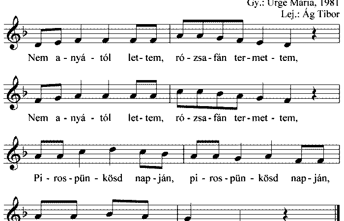 1. Nem anyától lettem, rózsafán termettem, Nem anyától lettem, rózsafán termettem, Piros pünkösd napján, piros pünkösd napján Hajnalba születtem. 2....