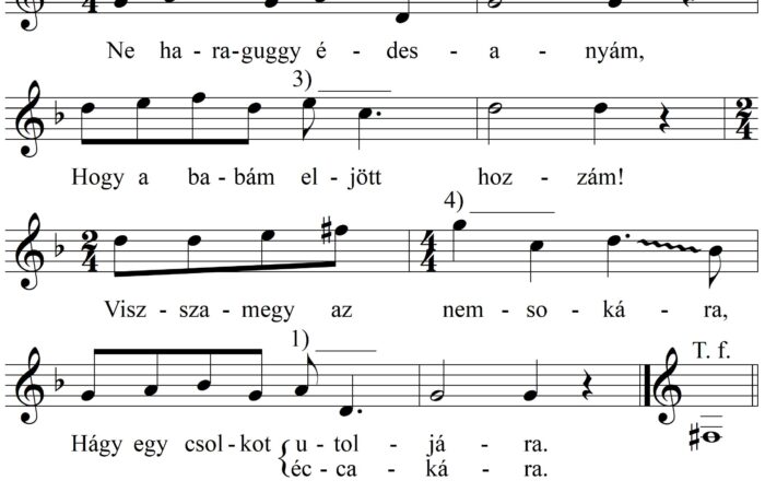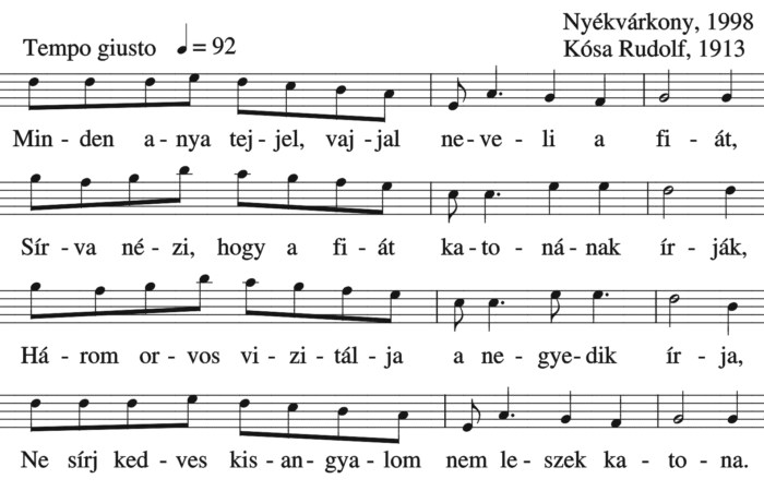 1. Ne haraguggyj édesanyám, Hogy a babám eljön hozzám! Vissza megy az nemsokára, Hágy egy csolkot utoljára / éccakára. 2....