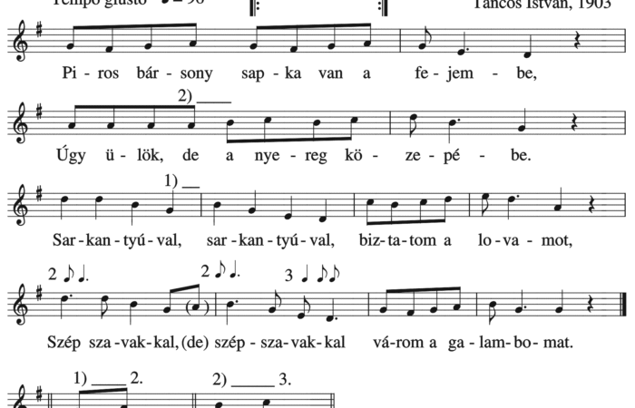 Piros bársony sapka van a fejembe, Úgy ülök, de a nyereg közepébe. Sarkantyúval, sarkantyúval biztatom a lovamot, Szép szavakkal, (de)...