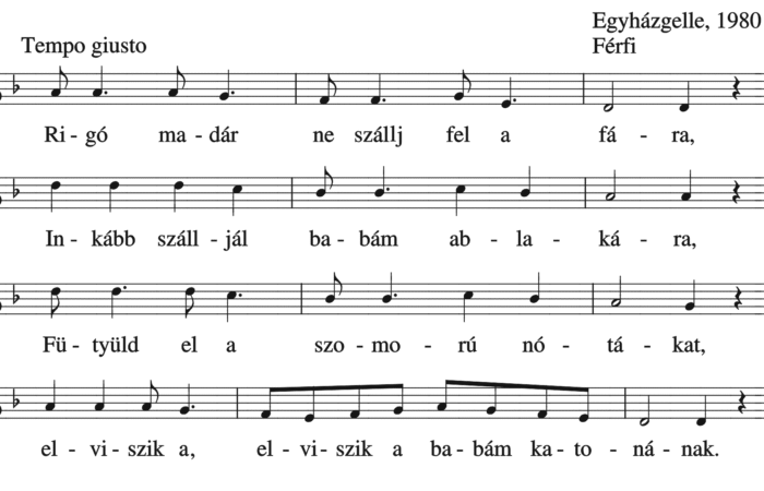 Rigómadár, ne szállj fel a fára, Inkább szálljál babám ablakára. Fütyüld el a szomorú nótákat, Elviszik a, elviszik a babám...