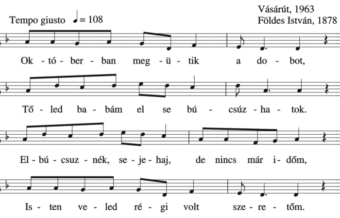 Októberban megütik a dobot, Tőled babám el se búcsúzhatok. Elbúcsuznék, sejehaj, de nincs már időm, Isten veled régi volt szeretőm....