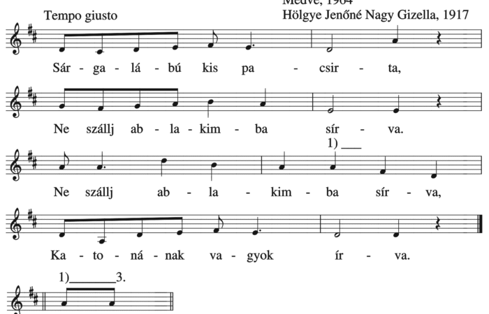 Sárgalábú kis pacsirta, Ne szállj ablakimba sírva. Ne szállj ablakimba sírva, Katonának vagyok írva. Katona az én életem, Oldalamon a...