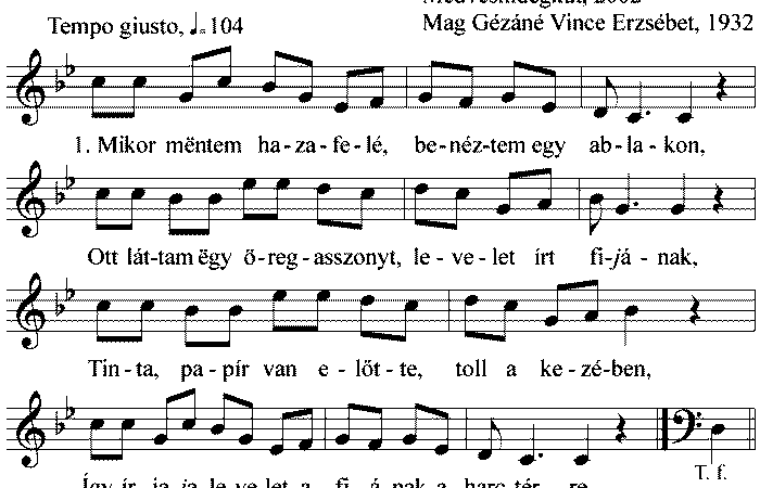 1. Mikor mëntem hazafelé, benéztem egy ablakon, Ott láttam egy öregasszonyt, levelet írt fijának. Tinta, papír van előtte, toll a...