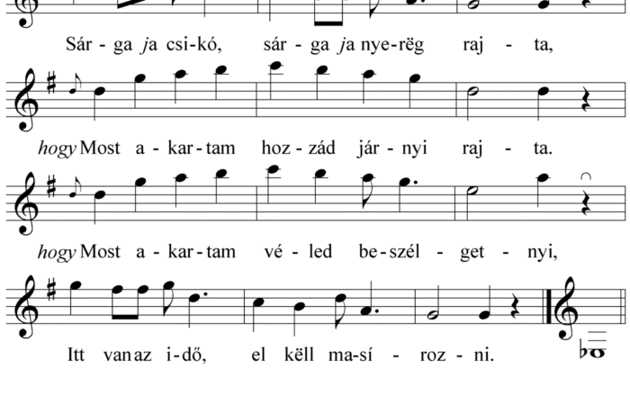 Sárga ja csikó, sárga ja nyerëg rajta, hogy Most akartam hozzád járnyi rajta. hogy Most akartam véled beszégetnyi, Itt van...