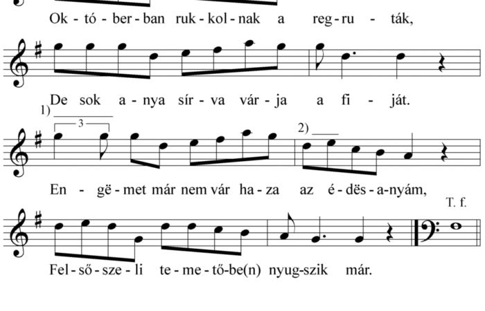 1. Októberban rukkolnak a regruták, De sok anya sírva várja a fiát. Engëmet már nem vár haza az édesanyám, Felsőszeli temetőbe(n )nyugszik...