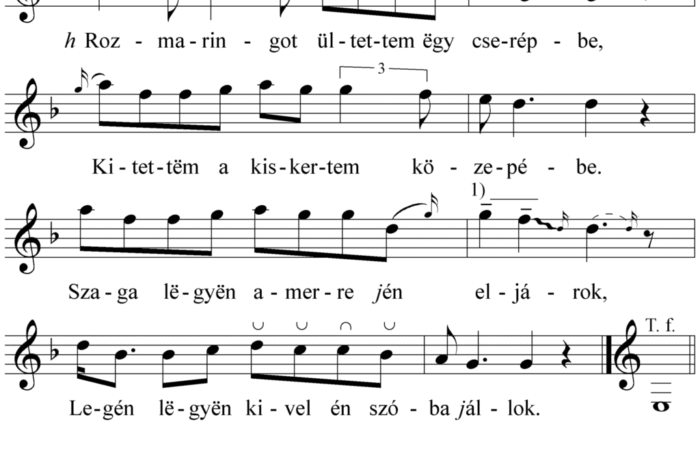 Rozmaringot ültettem ëgy csërépbe, Kitëttem a kiskertem közepébe. Szaga lëgyen amerre én eljárok, Legén lëgyën kivel jén szóba állok.