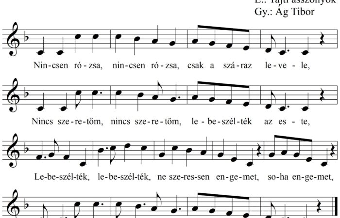 1. Nincsen rózsa, nincsen rózsa, csak a száraz levele, Nincs szeretőm, nincs szeretőm, lebeszélték az este, Lebeszélték, lebeszélték, ne szeressen...