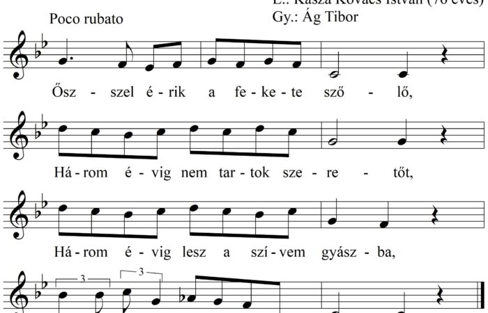 1. Ősszel érik a fekete szőlő, Három évig nem tartok szeretőt. Három évig lesz a szívem gyászba, Barna kislány kebelébe...
