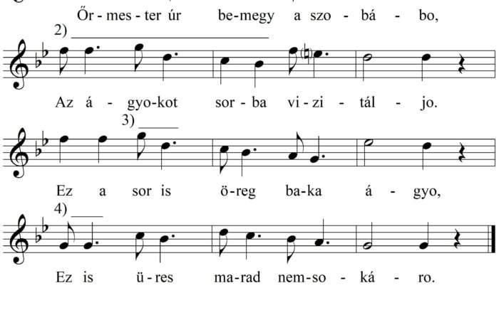 1. Őrmester úr bemegy a szobábo, Az ágyokot sorba vizitáljo. Ëz a sor is öreg baka ágyo, Ez is üres...
