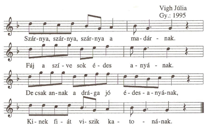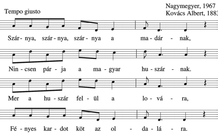 Szárnya, szárnya, szárnya a madárnak, Nincsen párja a magyar huszárnak. Mert a huszár felül a lovára, Fényes kardot köt az...