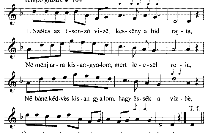 1. Széles az Isonzó vize, keskeny a híd rajta, Ne menj arra kisangyalom, mert leesel róla, Ne bánd kedves kisangyalom,...