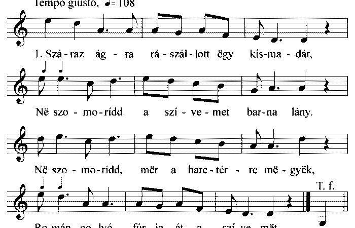 1. Száraz ágra rászállott egy kismadár, Ne szomorídd a szívemet barna lány, Ne szomorídd, mer a harctérre megyek, Román golyó...