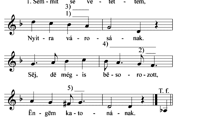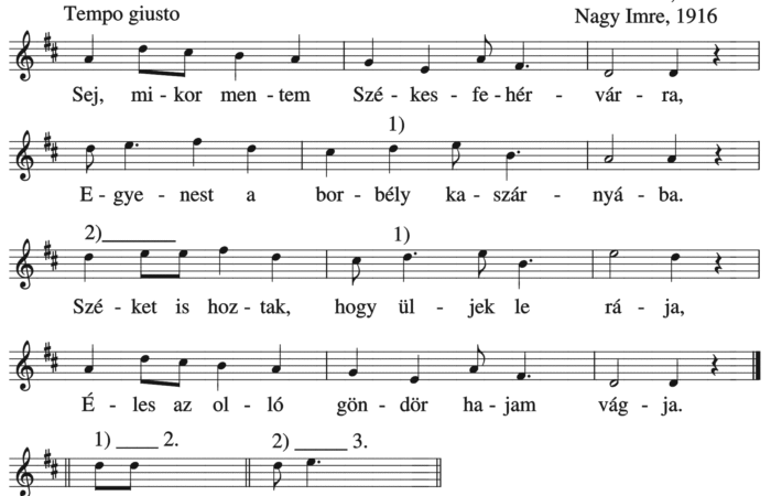 1. Semmit se vétettem, Nyitra városának, Sej, de mégis besorozott, Engem katonának. 2. Huszárnak sorozott, Bakancsnak iratott, Sëj, dë verjë...