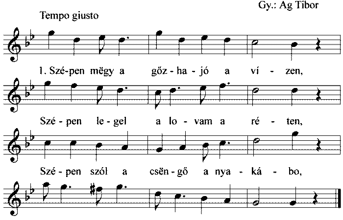 1. Szépen mëgy a gőzhajó a vízen, Szépen legel a lovam a réten, Szépen szól a csengő a nyakábo, Tijed...