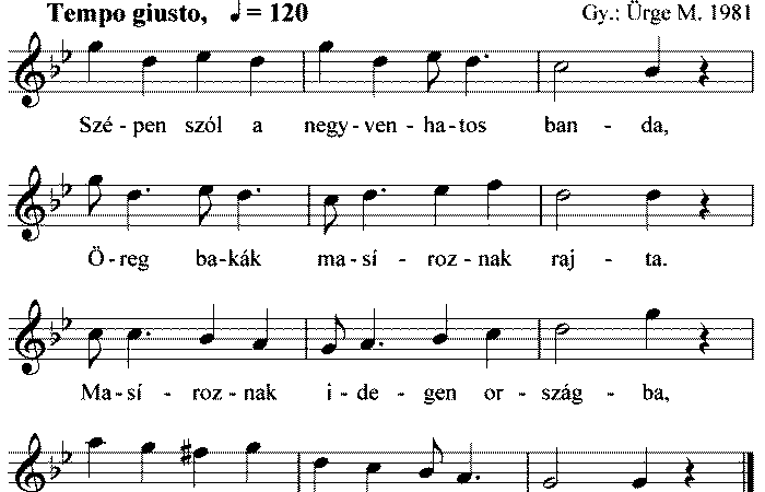 Szépen szól a harminckettes banda, Magyar fiúk maséroznak rajta. Maséroznak idegen országba, Dalmácia hëgyes határába. Jaj, Istenëm, hogy köll ott...
