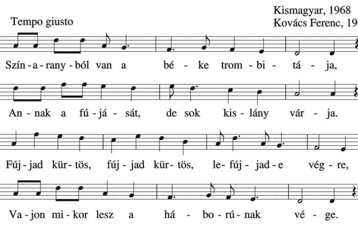 Színaranyból van a béke trombitája, Annak a fújását de sok kislány várja. Fújjad kürtös, fújjad kürtös, lefújjad-e végre, Vajon mikor...