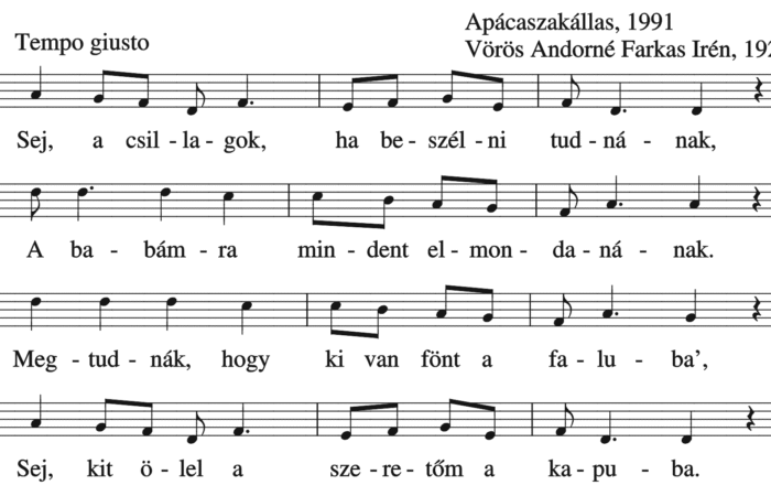Sej, a csillagok, ha beszélni tudnának, A babámra miondent elmondanának. Megtudnák, hogy ki van fönt a faluba’, Sej, kit ölel...