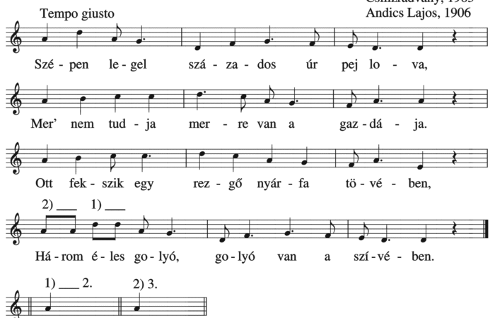 Szépen legel százados úr pejlova, Mer’ nem tudja merre van a gazdája. Ott fekszik egy rezgőnyárfa tövében, Három éles golyó,...