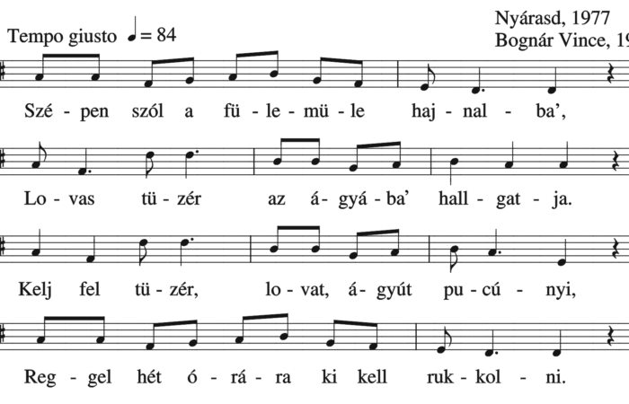 Szépen szól a fülemüle hajnalba’, Lovas tüzér az ágyába’ hallgatja. Kelj fel tüzér, lovat, ágyút pucúnyi, Reggel hét órára ki...