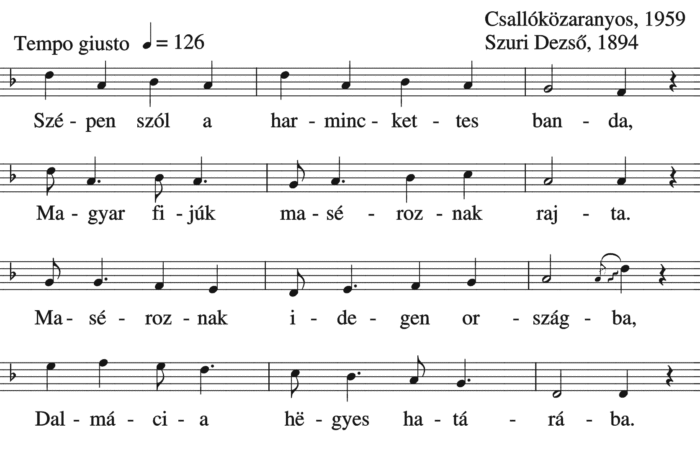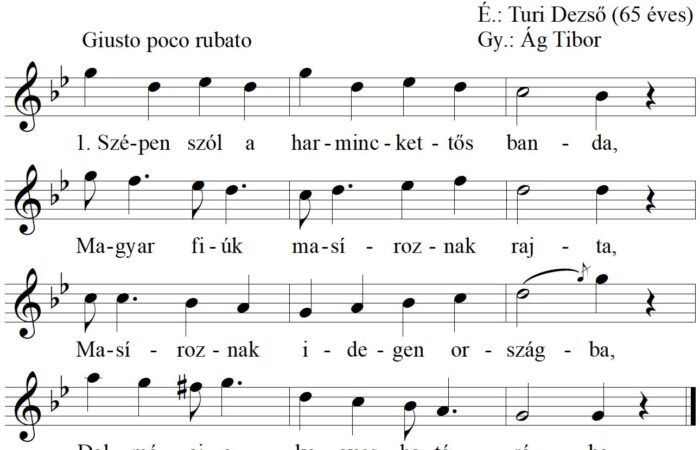 1. Szépen szól a harminckettős banda, Magyar fiúk masíroznak rajta, Masíroznak idegen országba, Dalmácia kegyes határába. 2. Jaj, Istenem, hogy...