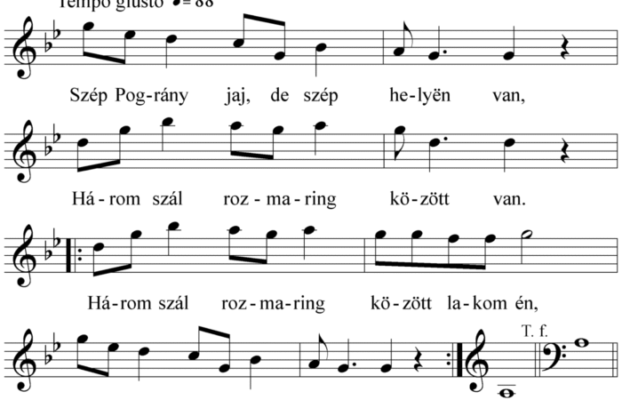 1. Szép Pográny jaj, de szép helyën van, Három szál rozmaring között van. Három szál rozmaring között lakom én, Beteg...