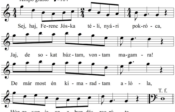 1. Sej, haj, Ferenc Jóska téli-nyári pokróca, Jaj, de sokat húztam, vontam magamra! De már most én kimaradtam alóla, Húzza,...