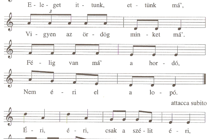 1. Eleget ittunk, ettünk már,Vigyen az ördög minket már,Félig van má a hordó,Nem éri el a lopó.Éri, éri csak a...