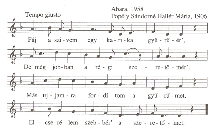 1. Fáj a szívem egy karika gyűrűér,De még jobban a szeretőmér.Más ujjamra fordítom a gyűrűmet,Elcserélem szebér a szeretőmet.