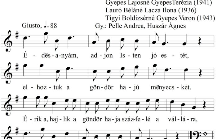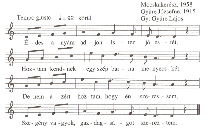 Édesanyám adjon Isten jó estét, Elhoztuk a kökényszemű menyecskét, De nem azér‘, hogy én őtet szeressem, hogy Édesanyám könnyebbségét keressem.
